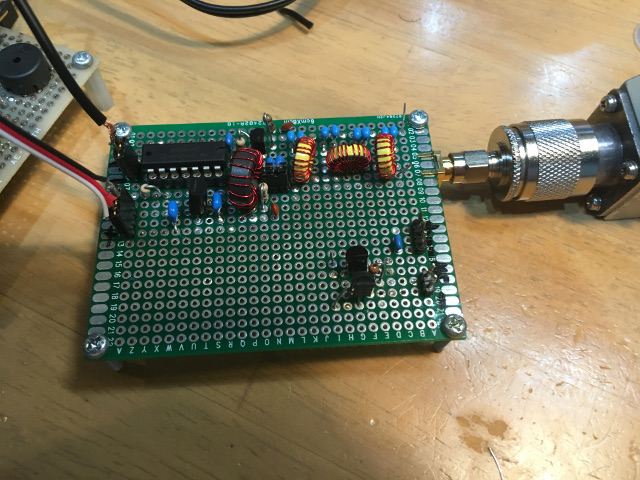送信部は、Si5351Aの残りの出力から直接ロジックICの74AC(HC)04のインバーター1回路に接続し、その出力を残りの5回路を並列接続したバッファに接続して出力をMOSFETのBS170のゲートにつなぎ、ドレイン出力に5段のπ型LPFとつなげ送信出力としました。